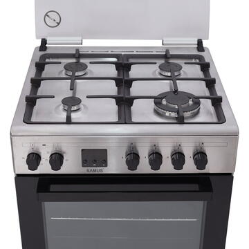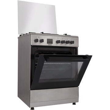4 arzătoare pe gaz (1 arzător WOK) Grătare din fontă Cuptor electric Cuptor cu 7 funcții Dimensiune cuptor: 56 L Eficiență energetică: clasa A Aprindere electrică Grill Ventilator Timer digital Lumină interioară Accesorii: 1 x grătar + 1 x tavă Capac din sticlă Culoare: Inox Dimensiuni brute: 650 x 670 x 892 mm (LxAxI) Dimensiuni nete: 598 x 610 x 830 (LxAxI) Greutate brută: 43,8 kg Greutate netă: 42 kg
