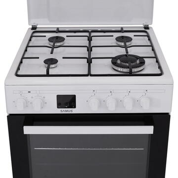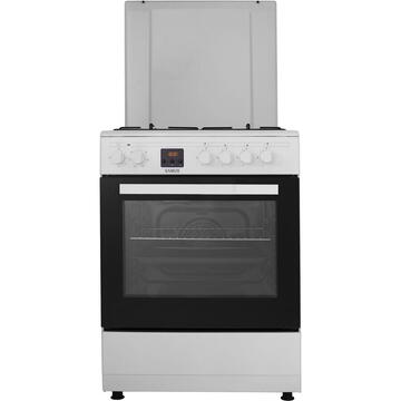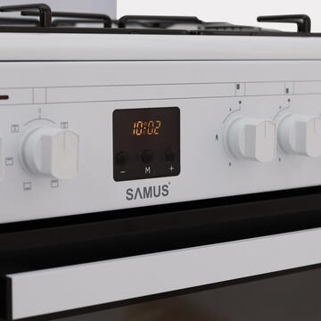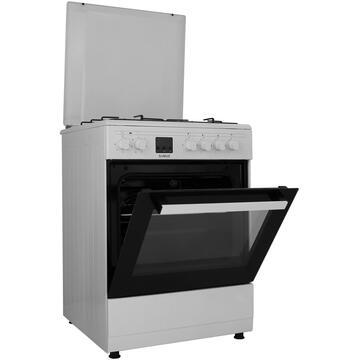 4 arzătoare pe gaz (1 arzător WOK) Cuptor electric Cuptor cu 7 funcții Dimensiune cuptor: 56 L Eficiență energetică: clasa A Aprindere electrică Grill Ventilator Timer digital Lumină interioară Accesorii: 1 x grătar + 1 x tavă Capac de metal Culoare: Alb Dimensiuni brute: 650 x 670 x 892 mm (LxAxI) Dimensiuni nete: 598 x 610 x 830 (LxAxI) Greutate brută: 43,8 kg Greutate netă: 42 kg