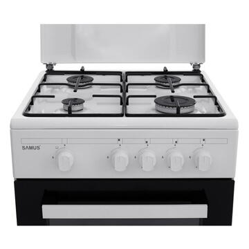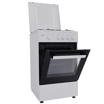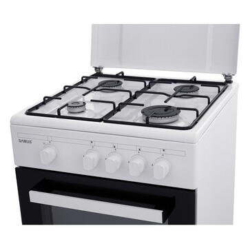 4 arzãtoare 50 x 50 cm Cuptor pe gaz Siguranţă plită + cuptor Geam dublu la cuptor Tavă + grătar cuptor Capac metal Montat pe gaz natural Diuze butelie Culoare albă Dimensiuni: 500x510x850mm (LxAxH) Dimensiuni brute: 550x600x890 mm (LxAxH) Greutate brută: 32.5 kg Greutate netă: 28.6 kg