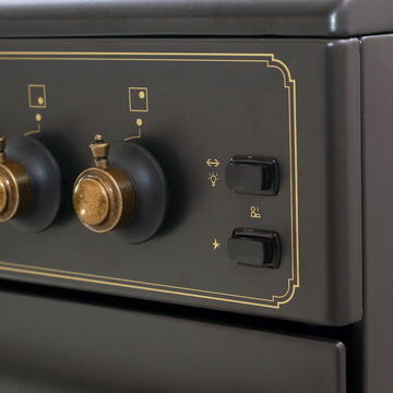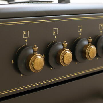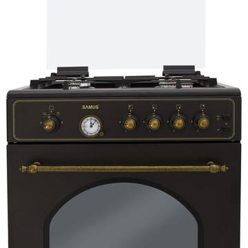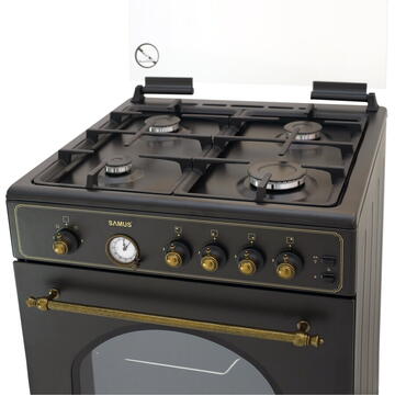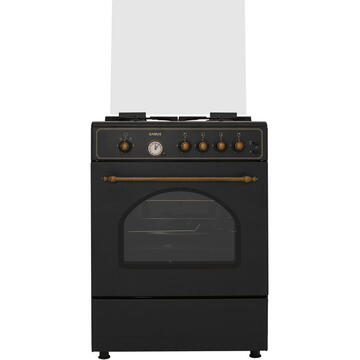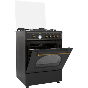4 arzătoare + cuptor pe gaz Aprindere electrică prin buton (plită) Capacitate cuptor 55 litri Siguranţă plită Grătare din fontă Timer analogic în stil rustic Capac din sticlă Geam dublu(Low-E) & lumină la cuptor Tavă + grătar cuptor Diuze GPL - separat Culoare Vintage Black Rustic Design(butoane, mâner, decor uşă cuptor în stil rustic) Dimensiuni nete : 598x610x860 mm (LxAxH) Dimensiuni brute: 650x670x892 mm (LxAxH) Greutate bruta:43 kg Greutate neta:41 kg