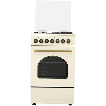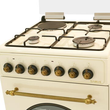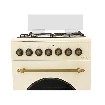 3 arzătoare pe gaz + 1 electric Aprindere electrică Cuptor electric(48 litri) cu 3 funcţii Putere cuptor 2200(1000+1200) W Siguranţă plită(la arzătoarele pe gaz) Timer mecanic Capac din sticlă Geam dublu(Low-E) la cuptor Tavă + grătar cuptor Clasă energetică A Diuze GPL - separat Culoare Vintage Beige Rustic Design(butoane, mâner, decor uşă cuptor în stil rustic) Dimensiuni nete : 500x564x813 mm LxAxH Dimensiuni brute: 550x600x890mm (LxAxH) Greutate bruta:30.5 kg Greutate neta:28.4 kg