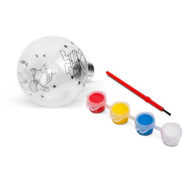 Acest ornament pentru brad de Crăciun care poate fi pictat este o modalitate creativă și distractivă de a-ți crea propriile decorațiuni unice de Crăciun pentru casă! Setul include o sferă de plastic cu diametrul de 80 mm, precum și vopsea albastră, albă, roșie și galbenă și o pensulă. Vopselele colorate diferite vă permit să vă creați propriile combinații de culori unice și să faceți decorul pentru brad de Crăciun visat. Cu ajutorul unei pensule se pot aplica usor acuarela pe sfera si pe figurina Mos Craciun. Sfera cu diametrul de 80 mm are dimensiunea ideală pentru a fi element decorativ și izbitor pe bradul de Crăciun sau în alte locuri. Vopseaua este de înaltă calitate, ușor de manevrat și are un timp scurt de uscare. Acest ornament de colorat pentru brad este și o activitate intercativă, creativă și distractivă de Crăciun pentru întreaga familie și vă permite să creați decorațiuni de Crăciun personalizate și unice.   Plastic durabil Două modele de Moș Crăciun Cu stele negre Cu capac argintiu Vopsea pentru accesorii și perie   Dimensiune: Ø80 mm Vopsea: 4 culori: roșu, albastru, galben, alb Culoarea sferei: Transparent (fără culoare) Model: Moș Crăciun Culoarea modelului: Negru Culoarea pensulei: Roșie Lungimea pensulei: 104 mm Greutate: ~18 mm