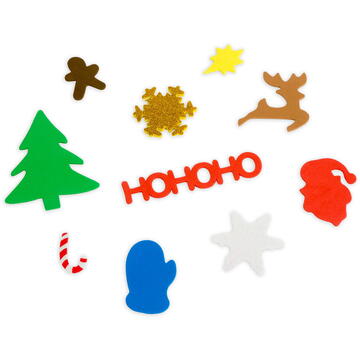 Set de 11 autocolante de Crăciun. Le poți plasa oriunde, astfel încât să obții diverse compoziții. Potrivite și pentru decorarea cadourilor, în funcție gusturi. Modele incluse: Moș Crăciun, „Ho-Ho-Ho”, reni, cristal de gheață, mănuși, stea, turtă dulce, pin, fulg de zăpadă, trestie de zahăr. 11 tipuri de motive de Crăciun 50 de autocolante / pachet Dimensiune: 35 - 100 mm Material: spumă