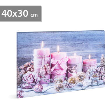 Casa ori biroul tău pot acum fi decorate cu imagini festive, cu LEDuri galbene. Acest decor special de perete arată bine în orice cameră, făcând orice casă în care sunt amplasate, unică. Funcționarea LED-urilor cu economie de energie este asigurată de 2 baterii AA. Durată lungă de viață a bateriei Comutator ON/OFF pe partea laterală a ramei 4 LEDuri galbene Dimensiune: 40 x 30 x 1,5 cm Număr găuri de agățare: 1 Număr LEDuri: 4 Culoare LED: Galben Alimentare: 2 baterii AA (nu sunt incluse)