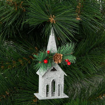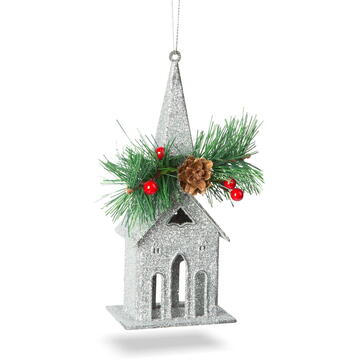Descriere Ornament de brad cu agățătoare - biserică - 16 x 6.5 cm - argintie de la Generic