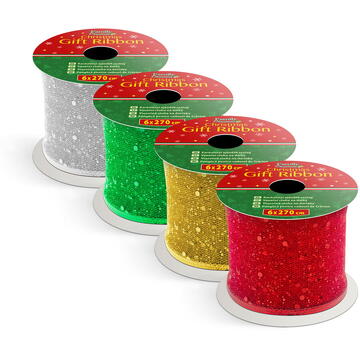 Decorează cadourile celor dragi cu aceste panglici strălucitoare. Excelente pentru a lega orice cutie cadou sau chiar pentru a crea flori! Disponibil în culori populare de Crăciun. O rolă conține 2,7 metri de panglică decorativă strălucitoare. Disponibil în roșu, verde, argintiu sau auriu Strălucitoare Ușor de utilizat Mărime: 6 x 270 cm Design: 4 tipuri Greutate: ~23 g