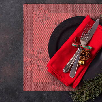 Masa festivă nu poate fi lăsată în afara atmosferei de sărbătoare. Napron cu fulg de nea disponibil in mai multe culori! Mare, usor de curatat Rezistent la apă Forma dreptunghiulară Protejeaza fata de masa de accidente   Dimensiune: 45 x 30 cm Material: PVC + 20% poliester Culoare: Roșu Spălare la maină: Da Greutate: ~83 g