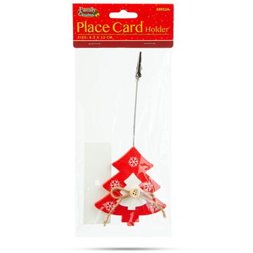 Acest suport de card de Crăciun este alegerea perfectă pentru orice eveniment festiv, prânz sau cină. Marcați locul oaspeților tăi la masă sau pur și simplu urează-le un Crăciun Fericit! Felicitarea este realizată din lemn, un material atemporal și prietenos cu mediul, contribuind în același timp la decorul tău festiv. Clemele din partea de sus facilitează atașarea cartelei de locație. Cu aspectul său unic și fermecător, succesul este garantat! Culori vesele Din lemn Ușor de asamblat Baza stabilă Clipuri puternice   Dimensiune: 8,5 x 12 x 3,2 cm Formă: Lemn de pin Culoare: Roșu/Alb Material: Lemn, metal Greutate: ~27 g