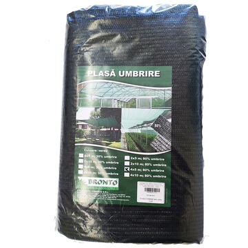 Plasa umbrire 80 4x5m este o plasa tricotata, usoara, rezistenta la intemperii, moale si durabila. Aceasta plasa are o latime de 4 metri , o lungime de 5 metri si o capaciate de umbrire de 80. Plasa pentru umbrire este ideala in scopul reducerii fascicolului de lumina, protectie impotriva vanturilor, a inghetului si a grindinei. Plasa se foloseste in solarii si sere, in gradini de legume, la culegerea fructelor in pomicutlura, la ferme pentru protejarea animalelor impotriva razei soarelui, in mod special in zilele de canicula. Aceasta plasa mai este folosita si in alte domenii, precum ca material de protectie in centrele de sport si bazine, ca si parasolar in gospodarie, dar si ca decorament pentru gardurile din plasa, pentru un design mai placut sau pentru a reduce vizibilitatea din interiorul curtii. Structura diferita a plasei ofera o umbra uniforma pentru plante si un flux de aer uniform cerut de sere, astfel imbunatatind cresterea plantelor, in conditiile climatic favorabile. Plasa de umbrire este realizata din polietilena de inalta densitate HDPE, ecologic si netoxic cu stabilizator UV.