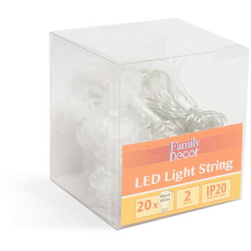 O ghirlandă veselă de lumini calde, cu un design prietenos, care vă va bucura imediat familia. Oferă casei tale o experiență vizuală minunată și o atmosferă de poveste. Ideal pentru decorarea pomului de Crăciun, dar nu numai. Această instalație se potrivește și în terase sau grădini, tot timpul anului! Datorită consumului redus de energie , acesta poate fi acționat de la baterie pentru o lungă perioadă de timp. Tehnologie LED Nu trebuie racordat la priză Poate fi amplasat oriunde Nu se încălzește Cu cablu transparent, subțire Dimensiunea matriței: 35 x 22 mm Număr de LED-uri: 20 Distanța între LED-uri: 10 cm Culoare LED: alb cald Sursa de alimentare: 3 baterii AA 1,5V (nu sunt incluse) Lungimea instalației: ~ 2 m Lungimea cablului până la suportul bateriei: 30 cm