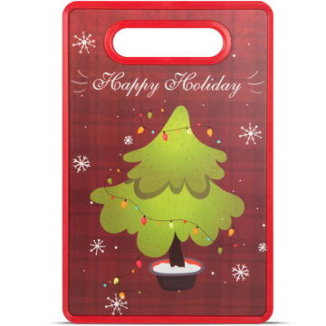 Placă de tăiat ușor de spălat din plastic rezistent. Ideală pentru felierea cărnii, legumelor, fructelor. Ușor de curățat Rezistent la tăieturi și zgârieturi Cu flanșă Nu se poate spăla în mașina de spălat vase Model: pom de Crăciun Material: Plastic + MDF Dimensiune: 30 x 20 cm Greutate: ~ 330 g