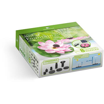 Creează o atmosferă plăcută în grădina ta cu această arteziană ce poate fi amplasată în iazurile din grădină sau piscine. Este alimentată de soare prin panourile solare încorporate. Nu este nevoie de cabluri, baterii sau alimentare CA. Aparatul poate fi utilizat cu 8 tipuri de duze, astfel oricine va găsi un model pe placul său. Produsul este ușor de utilizat: Puneți duza potrivită pe dispozitiv, conectați unitatea solară folosind mufa într-un loc uscat și apoi plasați produsul pe suprafața apei. Pompa din partea de jos a unității livrează apă prin duză. Înălțimea jetului de apă depinde iî mare măsura de intensitatea soarelui și de cantitatea de lumină furnizată (momentul zilei). Unitate solară externă Aduce suprafața apei la viață Funcționează într-un mod ecologic folosind energia solară Pornește chiar și atunci când este puțin soare ( dar funcționează doar la lumina soarelui) Jet de apă de până la 50 cm Dimensiune: 180 x 170 x 35 mm Panou solar: 7V / 1,4 W Puterea pompei de apă: DC 4.5V - 12V / 0.5 - 5W Dimensiunea coloanei de apă: Până la 50 cm Debit apă: 100 - 350 L/h Durata de viață:> 20.000 ore Temperatura de funcționare: +5 - (+ 50 ° C) Lungime cablu: 90 cm Culoare cablu: negru Material: plastic (EVA) Greutate: ~ 180 g Culoare: Verde / Roz / Negru
