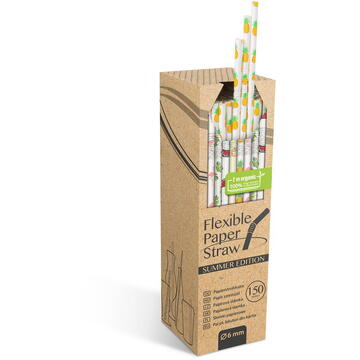 Paie din hartie pentru consumarea oricaror bauturi. De unica folosinta, nu este lavabil. • Ornament motive de vara • Confectionat din hartie Lungime: 250 mm Diametru: 6 mm Culoare: Ornament motive de vara Continutul pachetului: 150 buc.