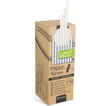 Paie din hartie pentru consumarea oricaror bauturi. De unica folosinta, nu este lavabil. • Ornament motive de vara • Confectionat din hartie Lungime: 197 mm Diametru: 6 mm Culoare: Alb Continutul pachetului: 150 buc.