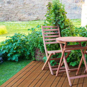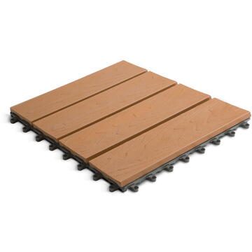 Acoperă-ți terasa și balconul cu podele WPC de calitate. Unitățile de 30 x 30 cm pot fi îmbinate cu ușurință între ele, astfel încât se poate realiza o suprafață stabilă de mers sub orice formă, chiar și o alee de grădină, o terasă la soare sau o insulă de relaxare. Pot fi folosite în interior sau chiar în exterior. Sunt rezistente la condițiile meteorologice, lumina soarelui, dăunători și apă. Nu este necesar un tratament de suprafață după cumpărare, acestea sunt gata de utilizare. Datorită suprafeței sale cu nervuri, are funcție anti-alunecare Plastic durabil, rezistent Ele pot fi strâns legate printr-o singură mișcare Poate fi tăiat la dimensiune cu un ferăstrău Poate fi îndoit într-o măsură limitată Ușor de curățat Material: WPC + plastic (PP) Tratarea suprafeței: Nu necesită Are rezistență limitată la: UV, apă, abur, îngheț (Acești factori le pot scurta durata de viață) Formă (1 buc 30 x 30 cm): 4 lamele 30 x 7 x 1,2 cm pe fiecare placă Conținut pachet: 11 buc 30 x 30 cm (~1 m²) Înălțime totală: 2 cm Temperatură recomandată: -25 - (+45°C) Tratament post cumpărare: Nu e necesar Culoare: Maro închis, model lemn Compatibilitate cu alte produse: 11543A / 11543B / 11544A / 11547