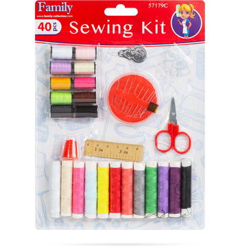 Set de cusut complet. Un accesoriu indispensabil pentru casa ta. Cu fire în mai multe culori, foarfecă, bandă de măsurare de 64 cm, 10 ace de cusut, 4 butoni, degetar din plastic pentru a preveni accidentele. Set complet 22 fire colorate 10 ace de diferite dimensiuni Culoarea butonilor: transparent