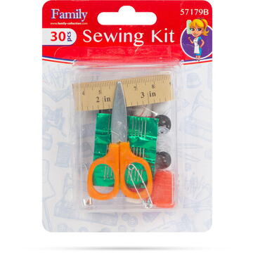 Set de cusut complet. Un accesoriu indispensabil pentru casa ta sau pentru călătorii. Cu 3 fire colorate diferite, foarfece de călătorie, 2 știfturi de siguranță (3,2 cm), bandă de măsurare de 64 cm, 12 ace de cusut, 9 butoni, degetar din plastic pentru a preveni accidentele și o cutie compactă din plastic pentru portabilitate. 12 ace foarfecă de călătorie degetar știft de siguranță bandă pentru măsurat dimensiune cutie: 80 x 57 mm culoare cutie: transparentă culoarea ațelor: negru, alb, roșu culoarea butonilor: transparent, negru