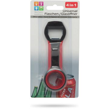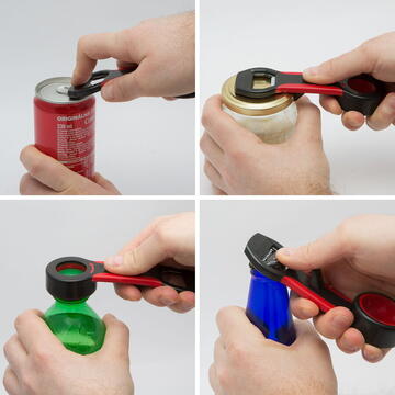 Poate deschide 4 tipuri diferite de capace și dopuri. Compact și ușor de folosit, nu ocupă loc în sertare sau în bagajele tale. Material: plastic Culoare: Roşu + negru
