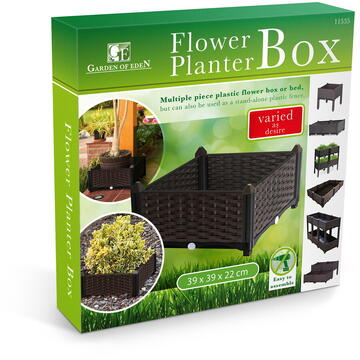 Ladă pentru flori din mat. plastic sau pat de flori format din elemente, utilizabil și ca gard de sine stătător. Elementele pot fi modelate și conectate între ele, după dorință. Utilizând mai multe seturi, se pot construi paturi de flori mai lungi sau mai înalte. Datorită orificiilor din partea inferioară, excesul de apă se poate scurge cu ușurință. Ideal pentru amplasarea pe balcoane, terase, sau grădini. Ladă de flori configurabilă după dorinţă Uşor de asamblat şi de configurat Rezistentă la intemperiile mediului Mat. plastic rezistent Aspect estetic Cu orificii de scurgere pe partea inferioară Dimensiuni: 39 x 39 x 22 cm Material: Material plastic Culoare: Maro închis Masa: 1,5 kg Sarcina maximă: 150 kg