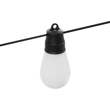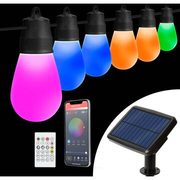 Vrei o terasă sau o grădină ieșită din comun? Luminează-ți casa cu șiruri luminoase și eficiente din punct de vedere energetic! Un șir luminos care seamănă cu un șir de becuri tradiționale, ce arată bine în orice spațiu de grădină. LED-urile colorate pot fi reglate cu telecomanda inclusă sau cu ajutorul unei aplicații gratuite pentru smartphone. Puteți alege dintre mai multe jocuri de lumini prestabilite iar fiecare LED poate chiar să se aprindă într-o culoare diferită. Este o alegere excelentă pentru o cină intimă în grădină, dar poate fi și o alegere ideală pentru petrecerile pline de viață.   Panou solar de inaltă performanță Design tradițional - bec Iluminare LED cu economie de energie Control prin aplicație Bluetooth IC încorporat, astfel încât să poată lumina cu diferite culori Design „de epocă”. Priză și cablu neagru Buton de pornire Telecomandă (24 de butoane) Instalare ușoară   Aplicație: Hello Fairy (Gratuită) Comunicare: Bluetooth 5.0 Compatibilitate: Android 4.0+, IOS 11.0+ Model: Bec Număr becuri: 30 Culori LED: RGBIC Alimentare: PV 110 x 80 mm Putere: 0,45 W Baterie: 3,7 V - 2200 mAh Ni-MH 18650 Panou PV: 5 V / 260 mA Lungime țăruș: 15 cm Intrare USB: 5 V Lungime totală: 14,37 m Mărime bec: 4,56 x Ø7,55 mm Distanța de la panoul PV la primul bec: 190 cm Lungimea segmentului luminos: 12,47 m Distanța între becuri: 45 cm Material: Plastic Indice de protecție: IP65 Greutate: ~1200 g