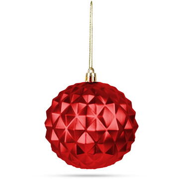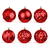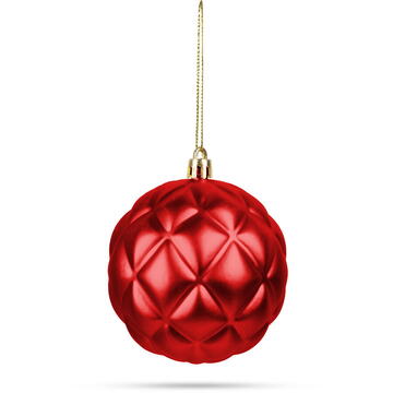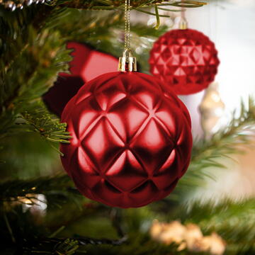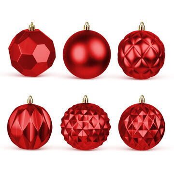 Globuri pentru brad, roșu mat, pentru un aspect elegant. 6 forme speciale, unice într-un singur set. Diametru: Ø73 mm Culoare: Roșie Lungime cârlig: 60 mm Conținut pacht: 6 piese Greutate: ~15 g / ornament