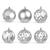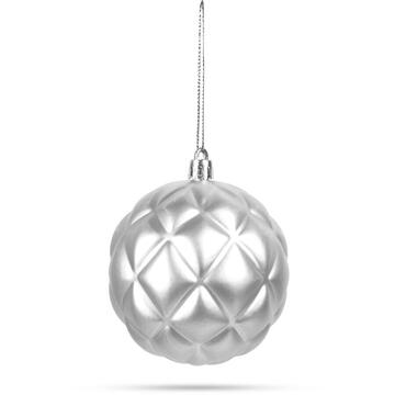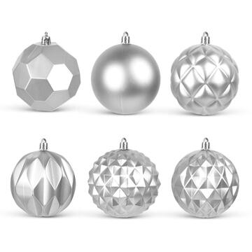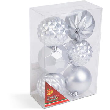 Globuri argintii pentru brad. 6 forme speciale, unice într-un singur set. Diametru: Ø73 mm Culoare: Argintie Lungime cârlig: 60 mm Conținut pacht: 6 piese Greutate: ~15 g / ornament
