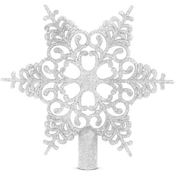 Vârful este un accesoriu esential pentru orice brad de Crăciun. Încoronează-ți decorul bradului de Crăciun cu acest ornament clasic auriu în formă de stea. Plastic durabil Culoare argintiu strălucitor Dimensiune: 20 x 20 cm Diametrul găurii: 18 mm Greutate: 35 g