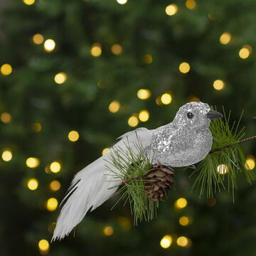 Ornament de Crăciun - pasăre cu sclipici - cu clemă - argintie - 2 buc/pachet