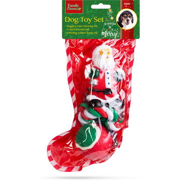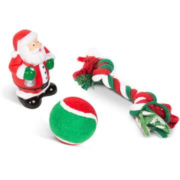Nici animalele de companie nu trebuie lăsate în afara atmosferei de Crăciun. Această jucărie masticabilă nu va fi doar favorita cățelușului tău, dar va face și parte din atmosfera sărbătorilor. Jucărie de mestecat cu frânghie robustă Minge de tenis colorată Jucărie de cauciuc care fluieră Roșu/alb/verde Mărime Moș Crăciun: 105 x 72 x 58 mm Diametru minge: Ø 62 mm Culoare: Roșu/alb/verde Material: Poliester, cauciuc (PVC) Greutate: ~170 g