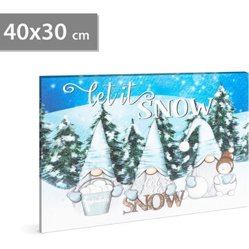 Casa ori biroul tău pot acum fi decorate cu imagini festive, cu LEDuri galbene. Acest decor special de perete arată bine în orice cameră, făcând unică orice casă în care este amplasat. Funcționarea LED-urilor cu economie de energie este asigurată de 2 baterii AA. Durată lungă de viață a bateriei Comutator ON/OFF pe partea laterală a ramei Dimensiune: 40 x 30 x 1,5 cm Număr găuri de agățare: 1 Număr LEDuri: 20 Culoare LED: Alb cald Alimentare: 2 baterii AA (nu sunt incluse)