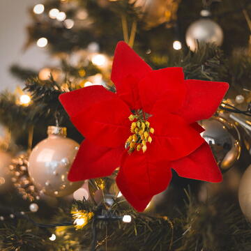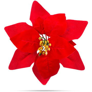 Poinsettia a devenit una dintre plantele de apartament simbolice ale Crăciunului. O copie realistă a unei flori vii te va răsfăța cu floarea ei în fiecare zi a anului și îți va aduce bucurie. Totuși nu trebuie să o uzi sau să ai grijă de ea. Pensa de rindere o face ușor de atașat oriunde. culoare rosie o floare   Mărime: 21 x 21 x 5 cm Culoare: Roșie Material: Plastic Greutate: ~8 g