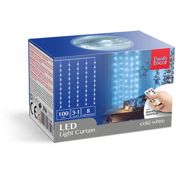 Împodobește-ți ferestrele casei cu această plasă luminoasă LED. Rețeaua de 100 de becuri este alimentată de o sursă de curent alternativ și poate fi folosită în aer liber datorită indicelui de protecție IP44. Datorită numărului mare de LED-uri, diversele jocuri de lumini, care pot fi reglate cu ajutorul butonului de silicon de pe adaptor sau prin telecomandă, oferă un spectacol vizual cu totul aparte. Ideală și pentru decorarea ferestrelor, filagoriilor și balcoanelor. 100 LEDuri Funcționare economică 8 moduri de iluminare Cablu alb Cu telecomandă Sursa de lumină: 100 x LED Culoare LED: Alb rece Număr șiruri luminoase: 10 Număr LEDuri pe fiecare șir: 10 Alimentare: 100 - 240V, 50/60 Hz Putere adaptor: 116 mA - 3,6 W Indice de protectie: IP44 (uz exterior) Moduri de iluminare: 8 Dimensiune totală: 300 x 100 cm Distanța între șiruri: 30 cm Distanța între LEDuri: 10 cm Mărime individuală LED: 5 mm Lungime cablu: 3 m Culoare calbu: Transparent