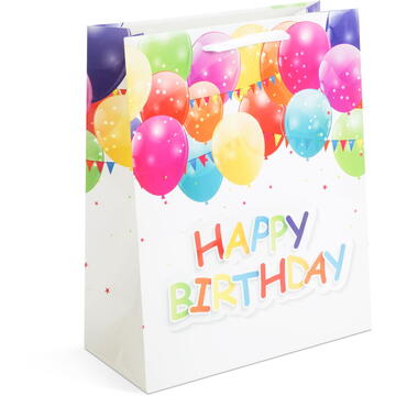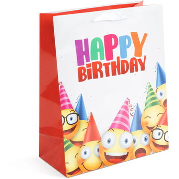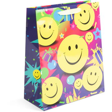 Este soluţia ideală pt. problema ambalării. Executat din carton lucios, elegant.     Carton lucios     Cu mâner tip panglică     4 designuri (Smilley, Happy Birthday, tort) Dimensiuni:    265 x 127 x 330 mm Lungime mâner:         40 cm
