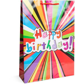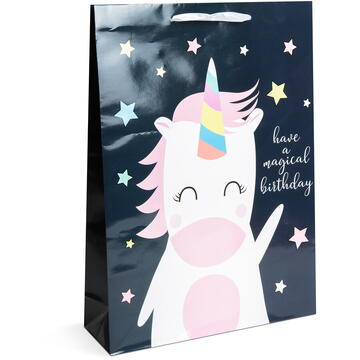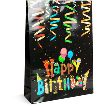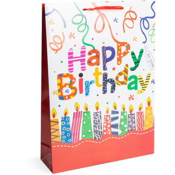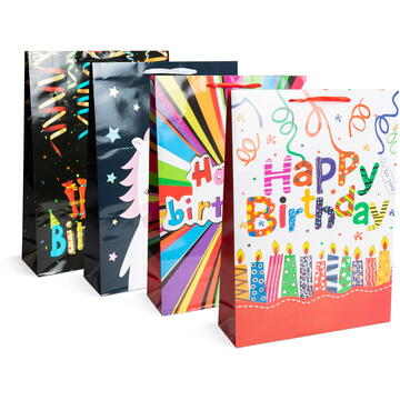 Este soluţia ideală pt. problema ambalării. Executat din carton lucios, elegant. Carton lucios Cu mâner tip panglică 4 designuri (Moş Crăciun, om de zăpadă, pinguin, ren) Dimensiuni: 330 x 102 x 457 mm Lungime mâner: 40 cm