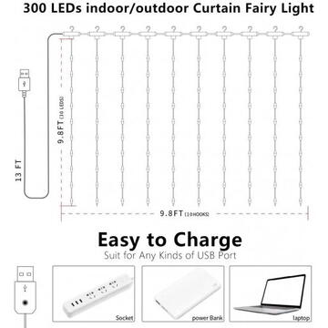 USB string curtain with 300 LEDs (3x3m) and 8 modes, timer and remote control (Warm white)