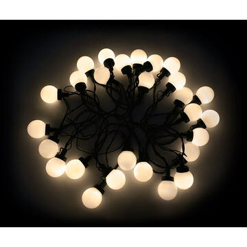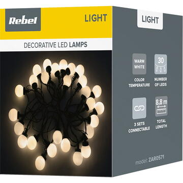 Tensiune: 31V Putere: 6W Curent consumat: 193 mA Alimentare: 220-240V; 50/60 Hz Numar de LED-uri: 30 Lungime: 8,8 m Distanța dintre diodele LED: 20 cm Lungimea cablului de la priză la primul LED: 3 m Clasa de rezistenta: IP44 Temperatura de functionare: -20 .... +40 grade C 8 moduri de iluminare Culoare: alb cald Posibilitatea de a combina trei seturi Becurile LED nu sunt înlocuibile Pentru uz extern
