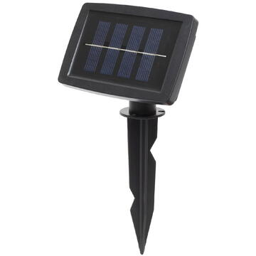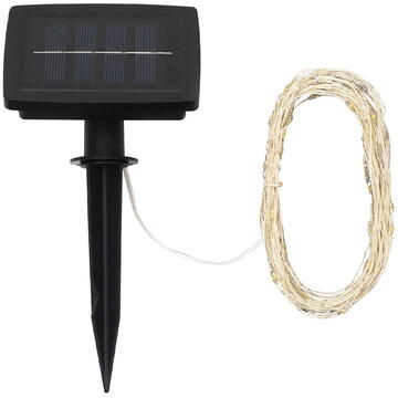versiune de interior și exterior 100 de micro LED-uri albe, calde se încarcă în timpul zilei, lumineaz ă în întuneric (max. 8 ore) panoul solar poate fi conectat la priză sau fixat pe perete moduri: oprit, lumină continuă sau intermitentă baterie înlocuibilă: 1 x 600 mAh Ni-MH, inclusă fir transparent