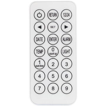 ecran LED mare, cu înălțime de 128mm vizibilitate perfectă ziua-noaptea lizibil și de la 50 de metri luminozitate cu reglare automată la condițiile de lumină din mediu reglarea manuală a luminozității pe arie largă ecran cu oprire de pe telecomandă, de ex. noaptea doi timpi de deșteptare simultan deșteptare cu sunet bip-bip puternic, timp de 1 minut format de timp 12 sau 24 ore afișare ora exactă, data și temperatura cronometru și timer toate funcțiile se pot controla și cu telecomanda așezare pe masă sau prindere pe perete memorie timp în cazul panei de curent, baterie CR2032 (3V), inclusă alimentare telecomandă: baterie buton CR2032 (3V), inclusă adaptor de rețea USB și cablu de conectare ~5,0m (incluși)