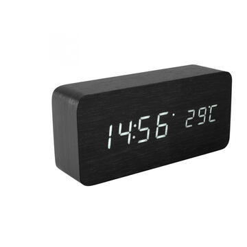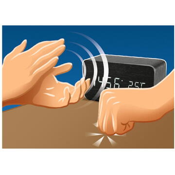 carcasă din lemn ecran cu LED, alb, lizibil opţiuni de afişare personalizabile ecranul se poate opri, dacă vă deranjează lumina în timpul nopţii ecranul se poate activa cu aplauze sau atingerea suprafeţei de lângă ceas ora exactă – data – temperatura (0…50°C) afişare în 12/24 de ore deşteptare cu sunet bip-bip timp de 1 minut 3 timpi de alarmă simultan alimentare: adaptor de reţea (inclus) sau 3 baterii AAA (nu sunt incluse) baterie tip buton (CR 2032) pentru memorarea orei exacte, inclusă dimensiune: 150 x 70 x 45 mm / 195 g