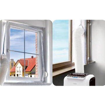 lângă o fereastră deschisă ține frigul înăuntru și căldura afară. montare simplă, cu scai poate fi montat pe toate tipurile de ferestre care se pot deschide, rabata racordarea furtunului de ieșire prin intermediul unui fermoar material durabil lungime: 4m bandă adezivă cu scai inclusă ideal pentru aparatele de aer condiționat mobile ACM 9000 și ACM 12000