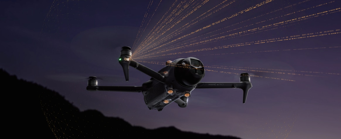 Mavic 4 Pro este echipat cu sase senzori de inalta performanta, low-light fi High Bright Display sheye cu o sensibilitate de 0,1 lux si procesoare duale pentru o constientizare de inalta rezolutie a mediului. Acesta realizeaza evitarea obstacolelor omnidirectionale la viteze de pana la 18 m/s in conditii de lumina slaba, folosind iluminarea iluminatului stradal pentru a detecta si evita obstacolele in timpul zborului si pe traseele de intoarcere. In conditii de intuneric aproape bezna (sub 0,1 lux), acesta poate utiliza LiDAR-ul orientat spre fata pentru a detecta obstacolele din fata si pentru a frana prompt pentru a evita coliziunile.