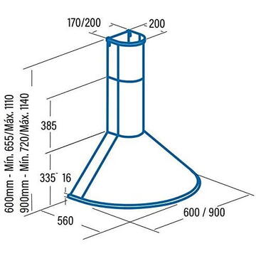 Funcții Panou de control mecanic 3 niveluri de tragere Putere de tragere I&scaron (conform UNE/EN 61591): 645m3/h - 385m3/h Debit maxim de aer (miscare libera ): 1115m3/ora Putere sonoră (Reg. (UE) Nr. 65/2014): 58 dB(A), maxim: 72 dB(A) motor M3R. Extrem de silențios. Consum maxim de energie 270W Înlocuire LED ap&scaron de înaltă eficiență Sistem usor de instalat Filtrele sunt sigure pentru mașina de spălat vase Finisajul este negru Max. presiune 430 Pa 150/125 mm diametru Clasa energetica: C