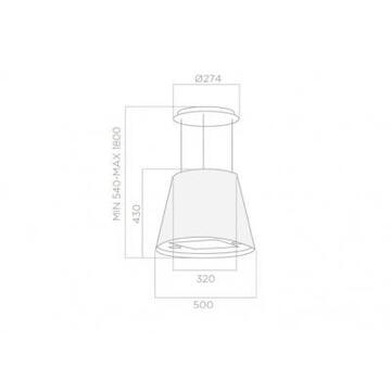 Culoare: Otel inoxidabil Latime (in mm): Ø 500 Inaltime (in mm): 430 Inaltime minima (in mm): 540 Inaltime maxima (in mm): 1800 Tip hota: Island Putere motor: 250 W Pozitie motor: Numar intern de motoare: 1 Număr de viteze de aspirație: 3 Tip de aspirație: Reciclare Indicator de saturație filtru: Da Debit minim de aer (m3/h): 240 Debit maxim de aer (m3/h): 600 Debit de aer în funcție de turație (m3/h) : V1 - 240 mc/h; V2 - 320 mc/h; V3 - 600 m3/h Diametru ieșire aer (în mm): 150 Nivel sonor min (dB): 47 Nivel sonor maxim (dB): 67 Nivel sonor în funcție de viteză (dB): V1 - 47 dB; V2 - 54dB; V3 - 67dB Presiune (PBEP)(PA): 434 Consum anual de energie electrică (AEC)(KWH/A): 49,5 Iluminare: lămpi LED Număr lămpi: 2 x 2,5 W Filtre pentru grăsime: Filtru pentru grăsime inclus Tipuri de filtre pentru grăsime: grăsime: Filtru cărbune din aluminiu : Filtru de cărbune inclus Tipuri de filtre de cărbune: Filtru de lungă durată Referință filtru de cărbune: CFC0140088 Clasa de eficiență energetică: A Clasa de eficiență luminoasă: A Clasa de eficiență fluidodinamică: A unsori: C Tip de control: Lumină moale 3V Temperatura Kelvin (°K): 3500
