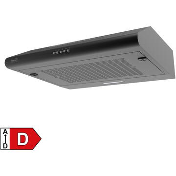 placă de oțel vopsită în negru control cu buton de apăsare (mecanic) trei trepte de viteză lampă LED de 1x1,5 W furnizat cu 1 filtru de grăsime cu 3 straturi de plasă de aluminiu, poate fi spălat (KPE 60/A) accesoriu set de 2 filtre de carbon (KPE 6038/C) ventilație externă sau cu recirculare modele cu 2 motoare debit maxim de aer: 380 m3/h puterea maximă a motorului: 200 W orificiul de ieșire a aerului: 120 mm clasa energetică: D dimensiune: 59,7 x 14 x 50 cm
