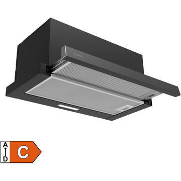 negru cu întrerupătoare basculante două trepte de viteză lampă LED de 1x1,5 W accesoriu set filtru de grăsime cu plasă de aluminiu cu 4 straturi, poate fi spălat (KPE 6044/A) accesoriu set de 2 filtre de carbon (KPE 6044/C) ventilație externă sau cu recirculare debit maxim de aer: 440 m3/h puterea maximă a motorului: 105 W orificiul de ieșire a aerului: 150 / 120 mm (cu limitator) clasa energetică: C dimensiune: 59,5 x 25,5 x 28/42 cm