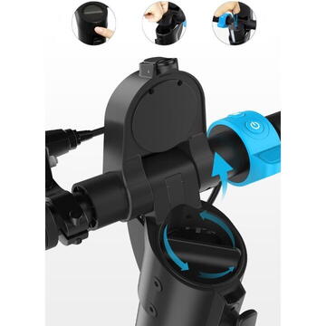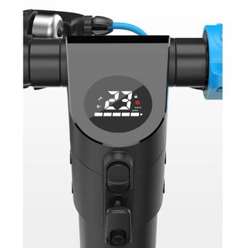 The distance which can be covered on a single charge of a 5.2 Ah battery ranges from 15 to 20 km, depending on the load, the type of surface on which the user is travelling, and the ambient temperature. A novelty, unique on the e-mobility market, is the ability to replace the battery with a spare, thanks to which the distance which can be covered on the scooter is twice as long. Replacing the battery is quick and easy, and it can be charged either when mounted in the scooter or separately after removing, as it has an independent charging socket. The battery is installed inside a solid and stable vertical pipe, which protects it from damage in an accident, and also against saturation.