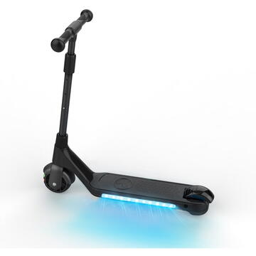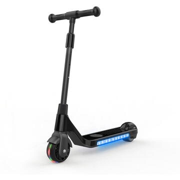 motor 80W Viteza maxima de pana la 6 km/h dupa pornirea motorului Pentru copii cu greutatea de pana la 50 kg Lumina LED colorata pe partea laterala a scuterului si pe roata din fata Baterie incorporata de 21,6 V 2,0 Ah Autonomie pana la 6 km Frana de picior pe roata din spate Volan reglabil pe inaltime Rezistent la stropire IPX4